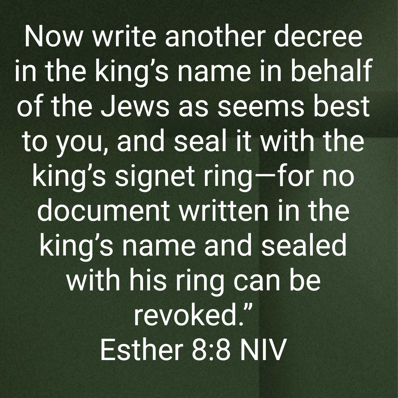 Haman has been killed, but the threat still remains. We find out that the evil decree that Haman had giveth people cannot be changed. It cannot be done away with or deleted. The decree will stand, so now the question becomes, what can Esther and Mordecai do to provide the Jews salvation.