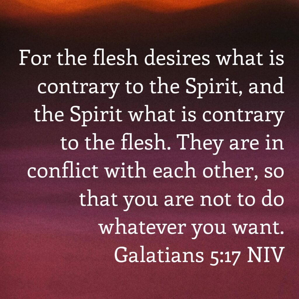 However, if we are not surrendered to Christ and not allowing him to live through us, then we will naturally produce the fruit of the flesh. We have to make sure that we are choosing the Spirit. This verse is very clear that what the flesh desires is against the Spirit and the Spirit has nothing to do with the flesh. Because we are fallen, sinful humans, our natural inclination is going to be to produce the fruit of the flesh. If we are left to our own desires and able to do whatever we want, we will naturally create all of those fleshly things in that list.